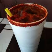 michelada clasica con cerveza corona, clamato, salsas, sal y limón
