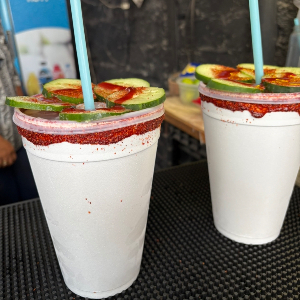 chamoy, hielo, tàjin, Pulpa de Tamarindo, Vodka, Refresco de Tamarindo, Gomitas, Decorado con Pepino, sal y Limon