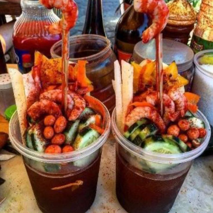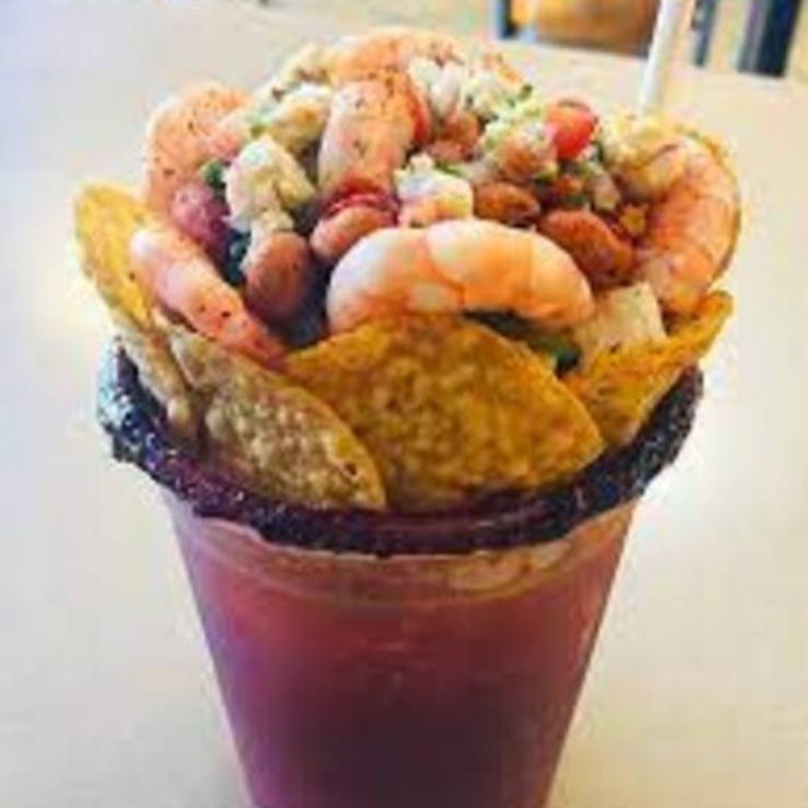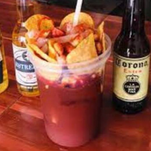 1 litro de exisita cubana o michelada va con camarones, cueritos, pepino y cacahuate con limon y chile