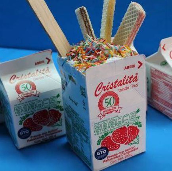 Fresas congeladas picadas acompañadas de crema batida y popote de chocolate.