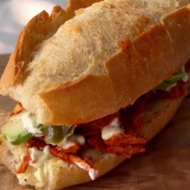 lonche de pierna con lechuga, jitomate, cebolla, crema,mayonesa,capstu,moztaza y aguacate.chiles jalapeños por aparte