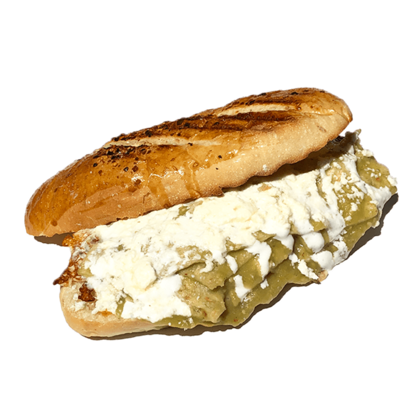 Bolillo, chilaquiles verdes, crema, chile serrano, queso y cebolla.