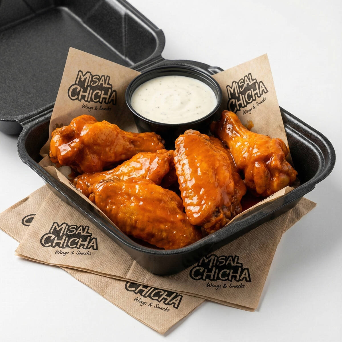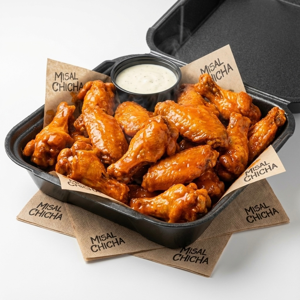 5 piezas de alitas de pollo fritas bañadas en la salsa de tu preferencia incluye un dip de dos onzas de aderezo ranch