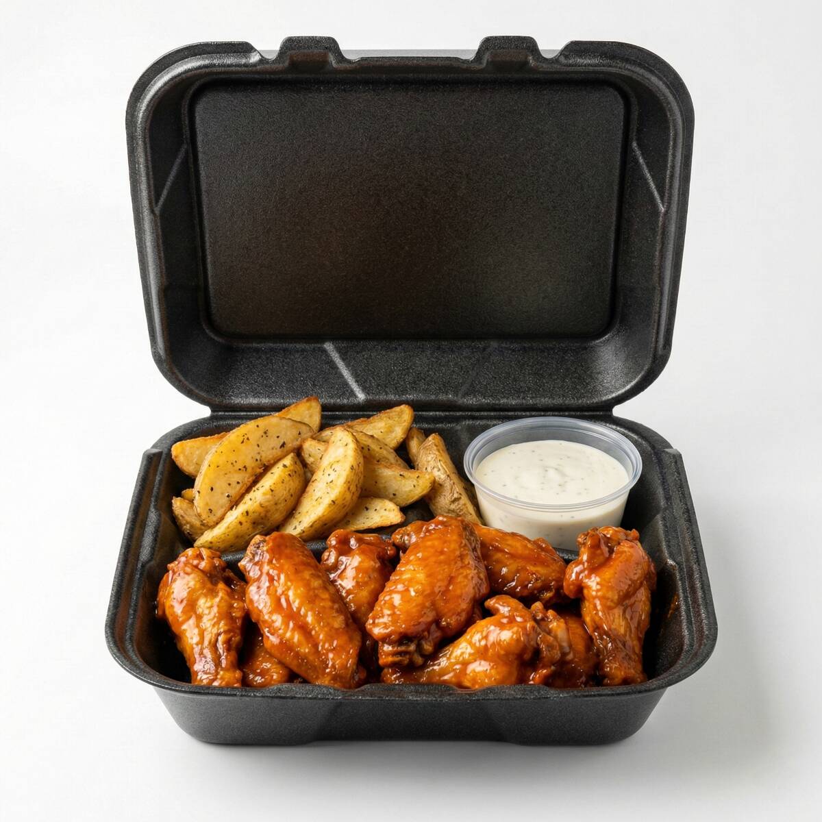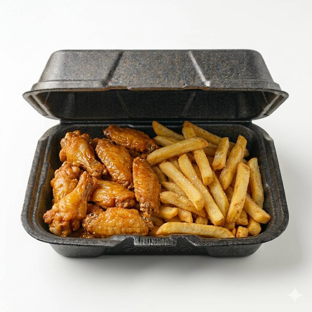 10 Piezas de Alitas ó 10 Boneless cubierto con la salsa de tu preferencia con papas francesa o papa gajo incluye 1 dip de ranch