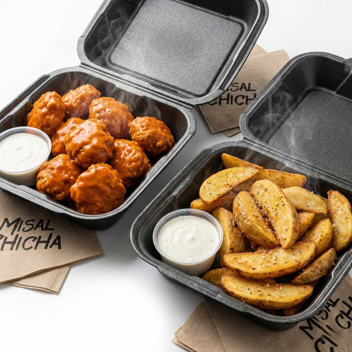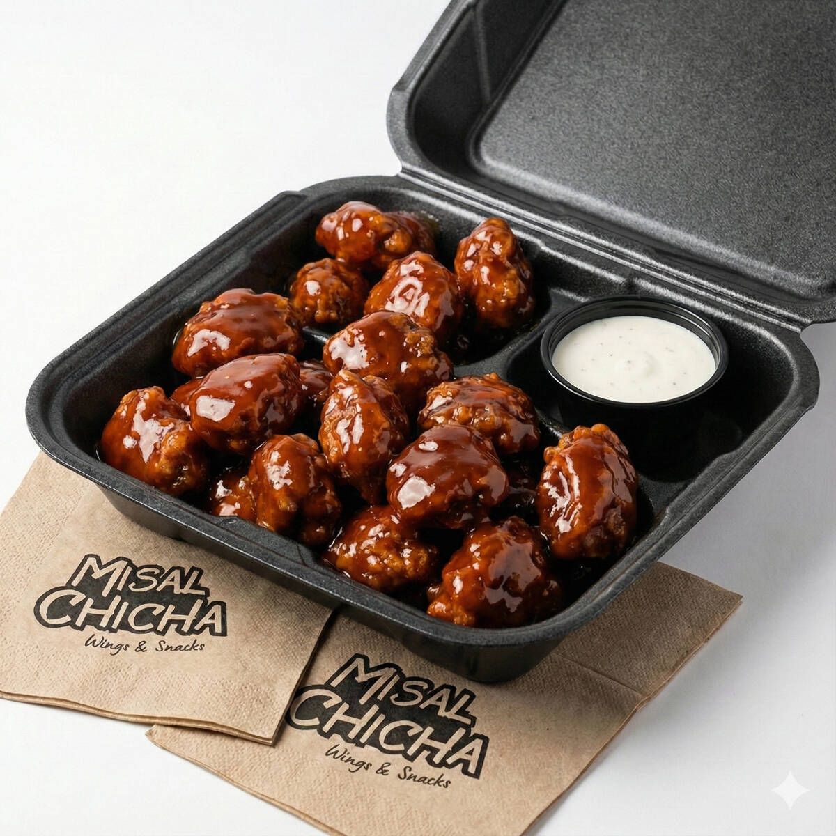 20 Piezas de boneless de pollo fritos cubiertos con la salsa de tu preferencia, incluye dos Dips de ranch