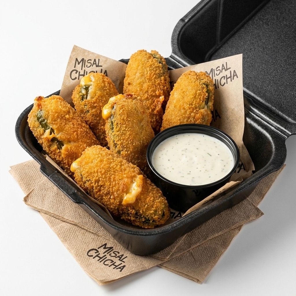 6 piezas de jalapeños poppers rellenos de queso crema empanizados. Incluye 1 Dip Ranch