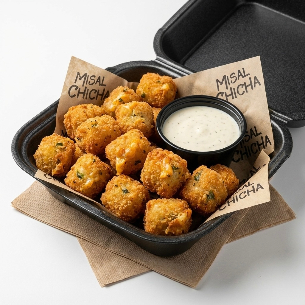 Bolitas de papa rellenas de queso y trozos de jalapeño. Incluye 1 Dip de ranch. (12 a 14 bolitas)