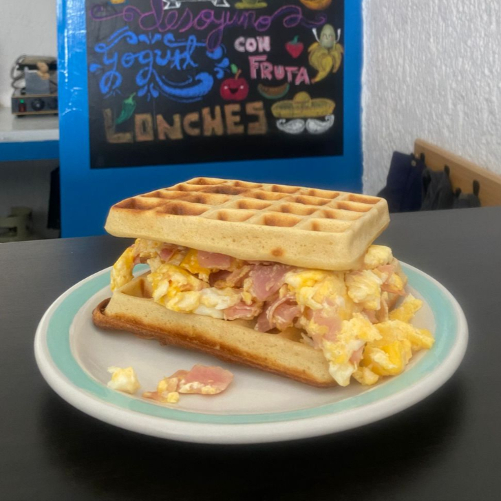 Waffle crujiente relleno de huevo suave y jamón dorado, una combinación clásica y deliciosa.
