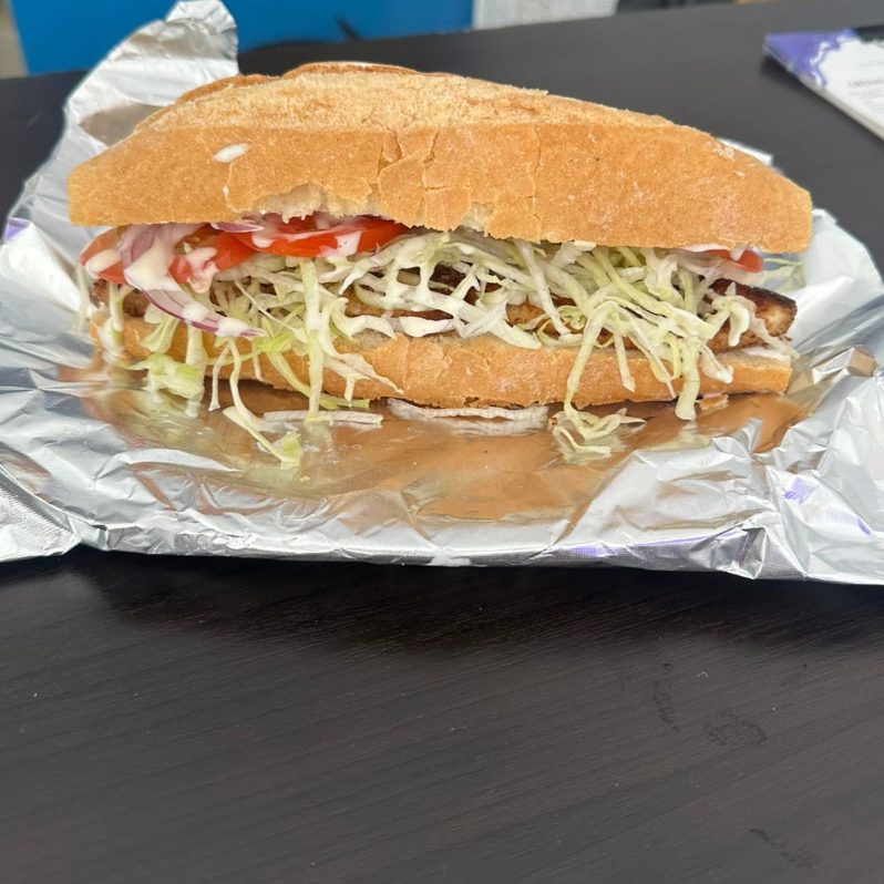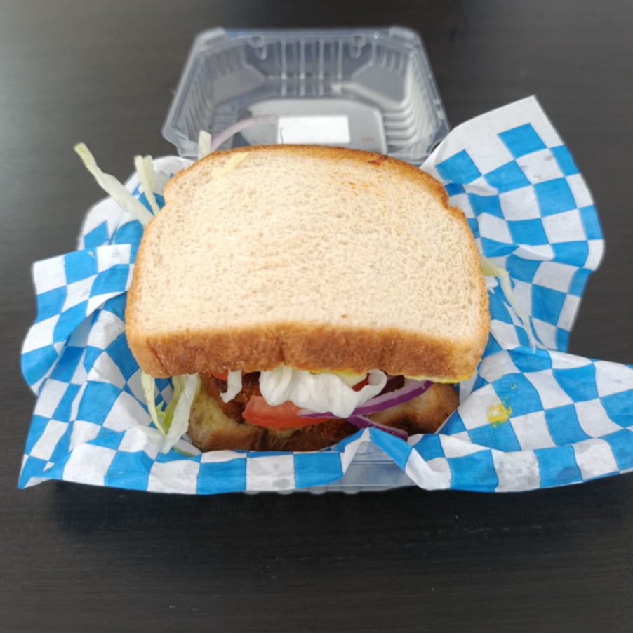Lonche suave con pollo empanizado crujiente, crema en el pan, lechuga, jitomate, cebolla, un toque de mostaza y aderezo ranch para acompañar.