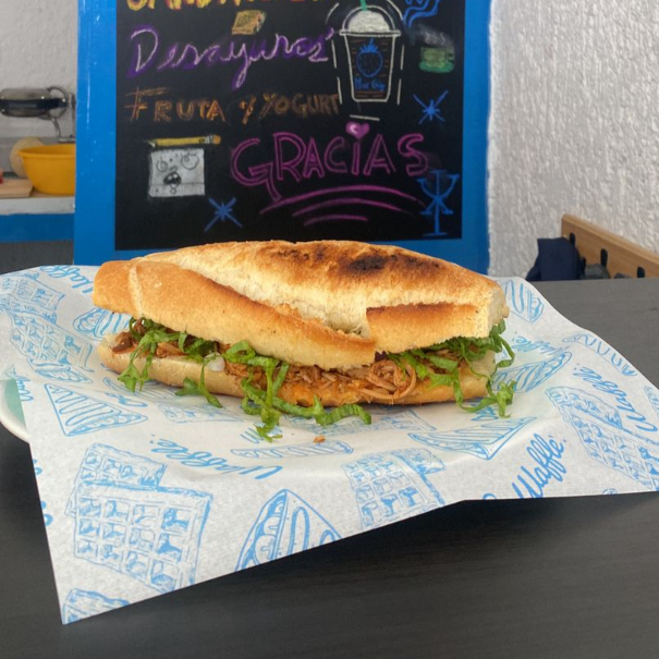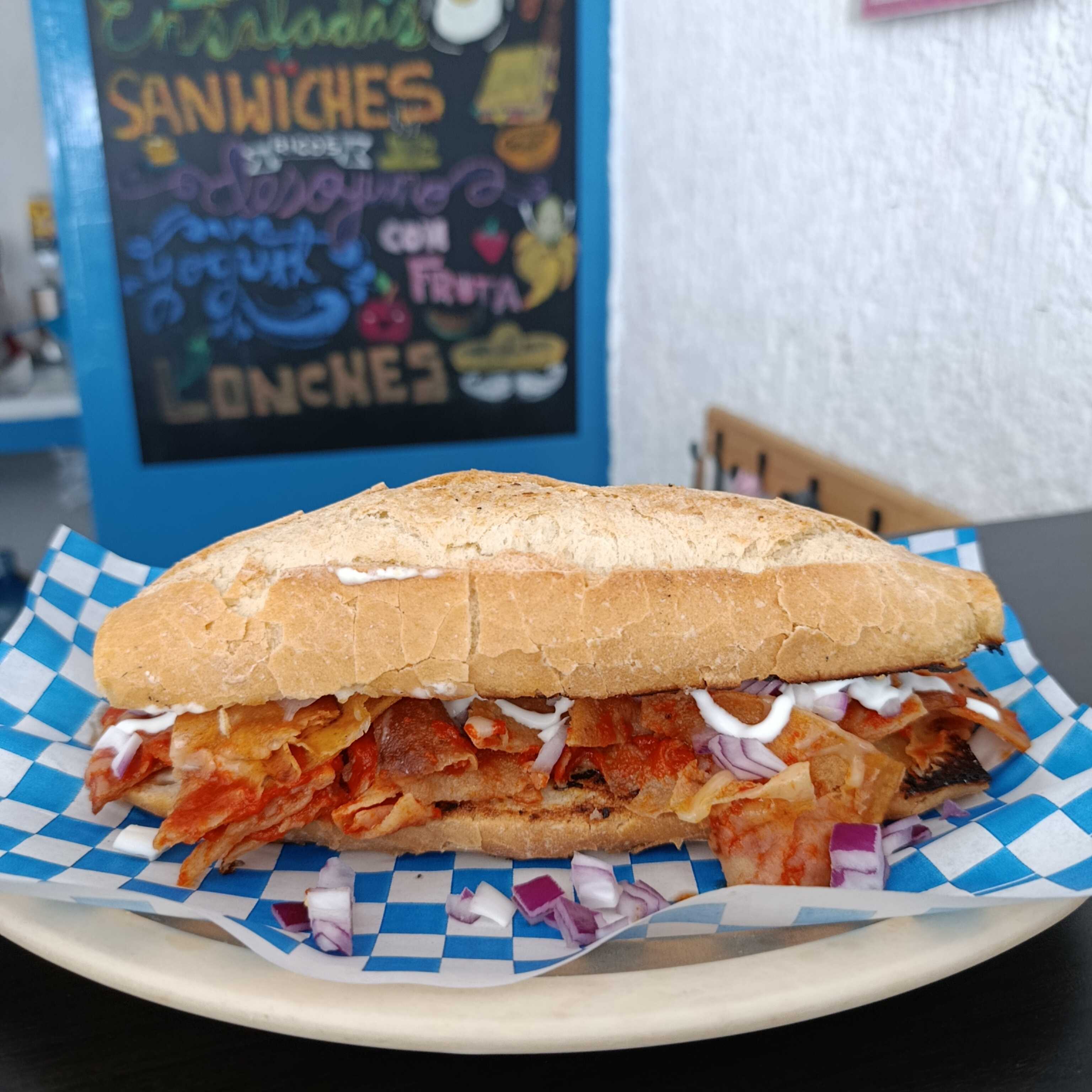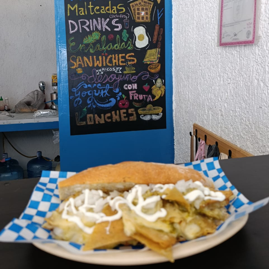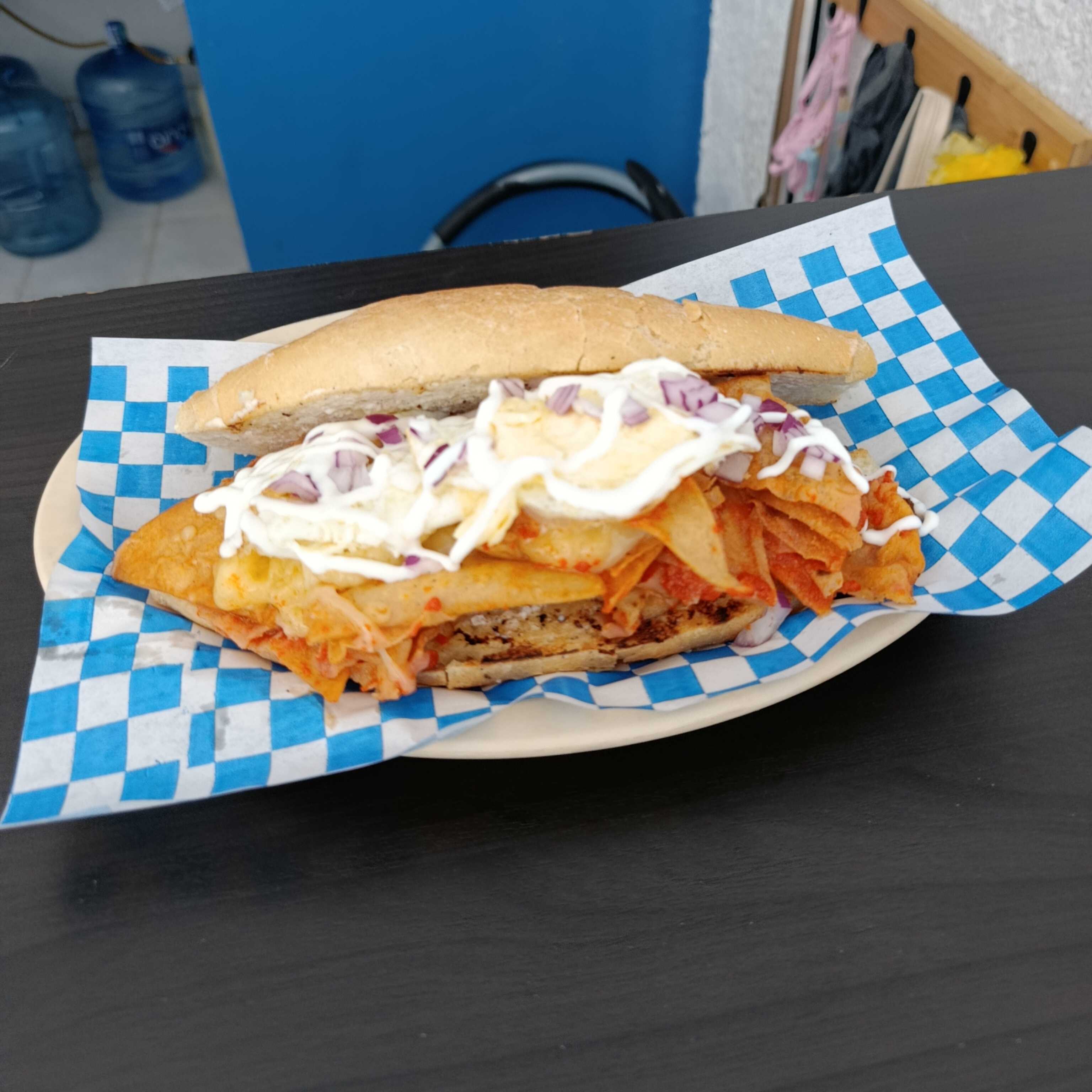 lonche de chilaquiles acompañado de cebolla y crema (pueden ser rojos o verdes)