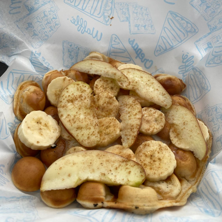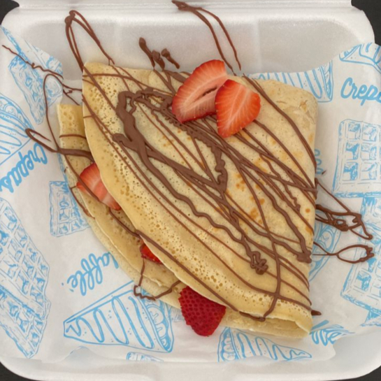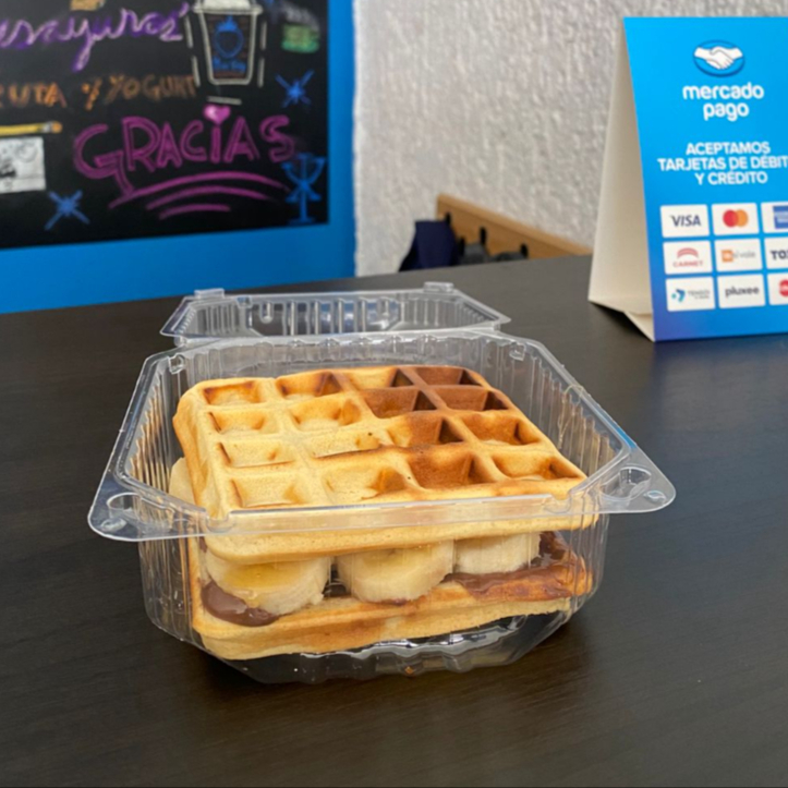 Un waffle cubierto con una capa cremosa de Nutella, rodajas frescas de fresa y plátano maduro. Una combinación dulce, suave y frutal que lo convierte en un desayuno o postre irresistible.