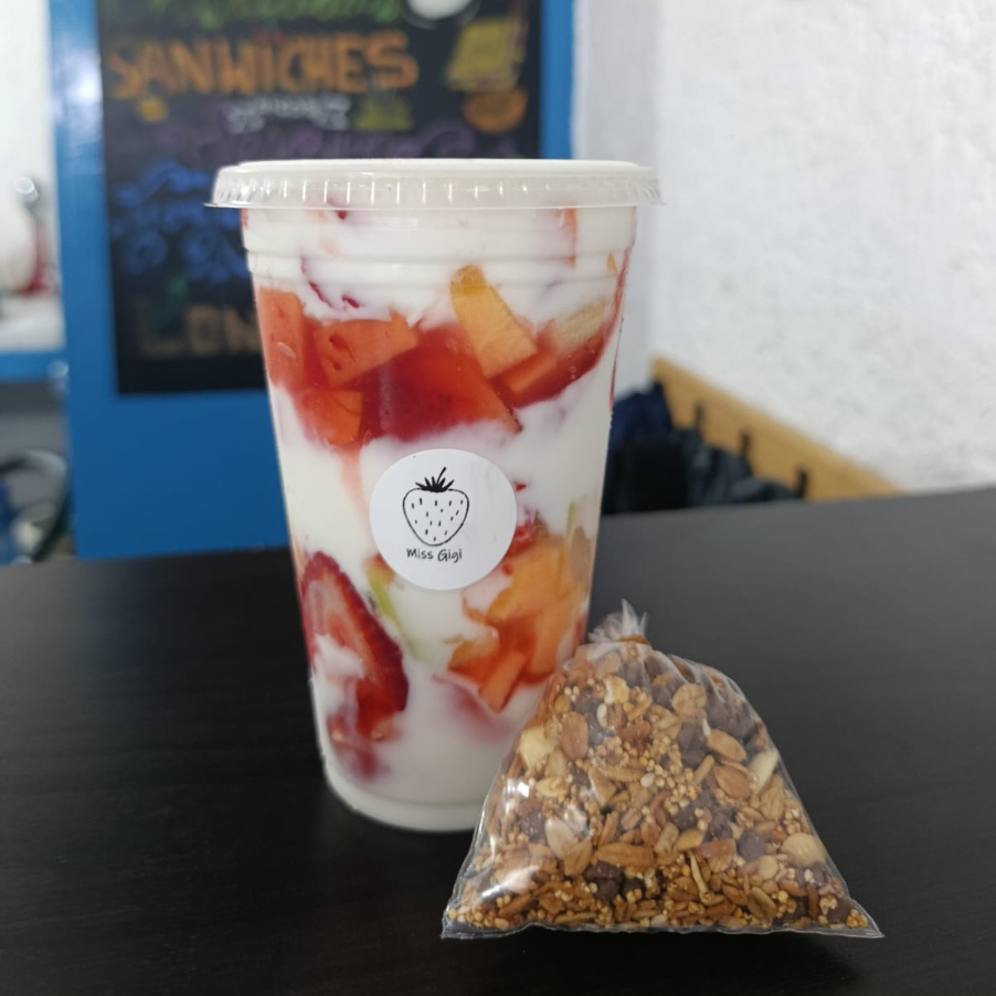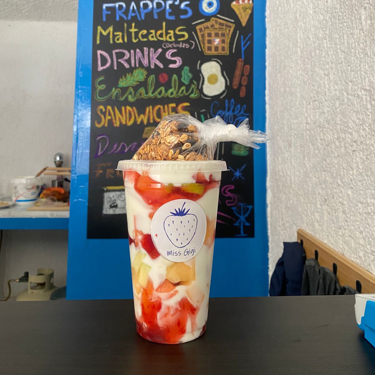 Yogurth cremoso y suave acompañado con fresa, Melón, papaya, manzana y Plátano.