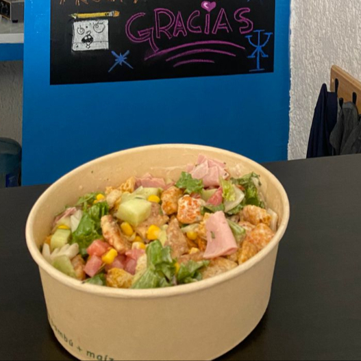 Una rica ensalada con lechuga de base, jitomate, cebolla, jamón, pepino, elote y zanahoria (aderezo al gusto)