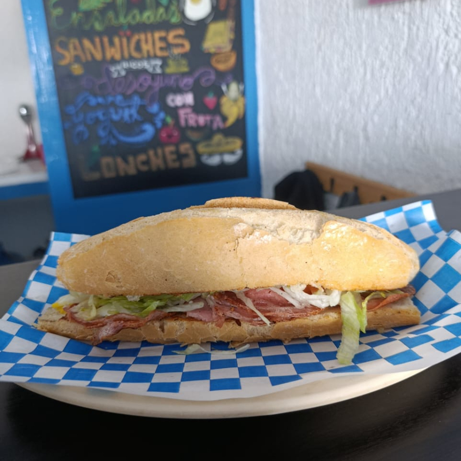 lonche de salami con queso acompañado de lechuga, jitomate y cebolla