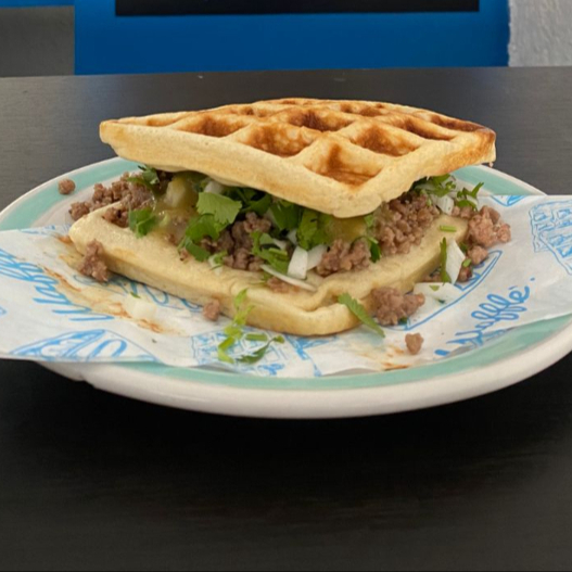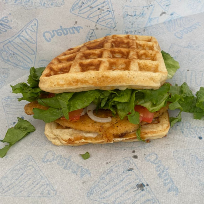 Waffle crujiente relleno de pollo jugoso, lechuga fresca, jitomate, cebolla, mostaza y aderezo ranch cremoso.