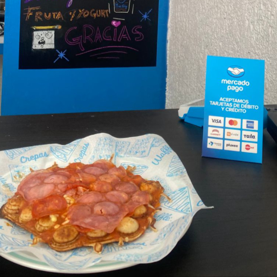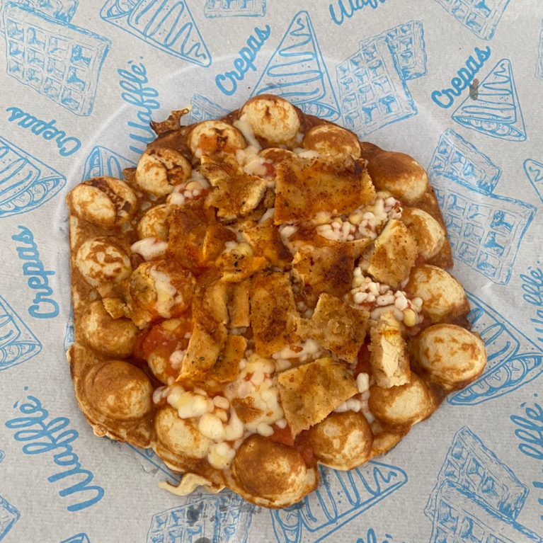 waffle bubble con queso, salsa de jitomate, jamon y salami