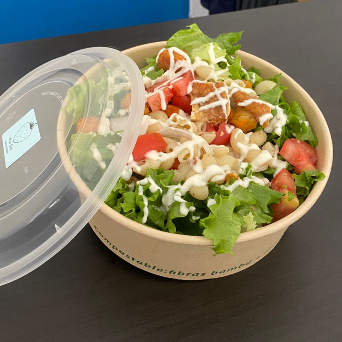 Ensalada fresca con cuadritos de pollo empanizado crujiente sobre lechuga, jitomate, cebolla, pepino, elote amarillo, pasta cocida y croutones dorados, acompañada del aderezo de tu elección: ranch, mango, mango habanero o búfalo.