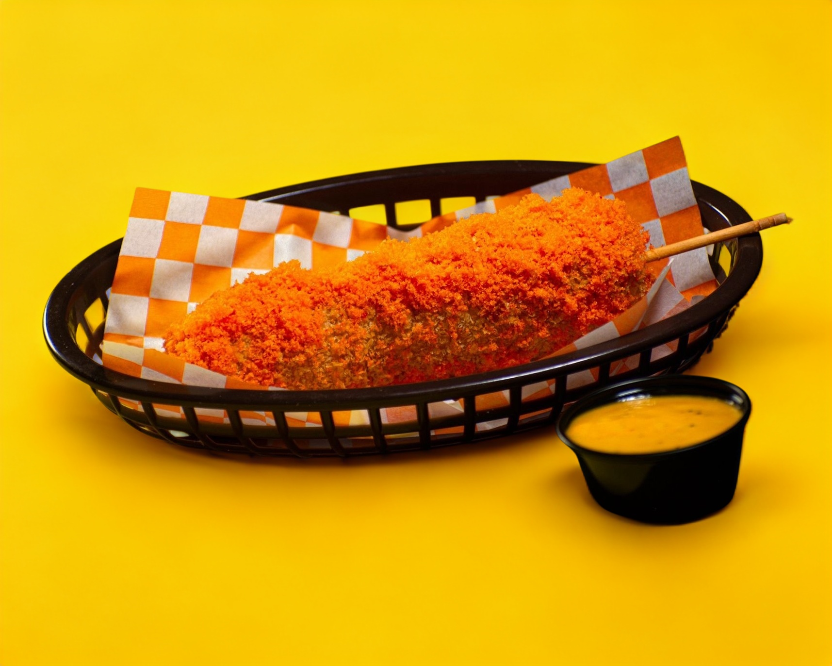 Banderilla koreana con Papa Natural y un ligero toque de Lemon Pepper rellena de Salchicha de Pavo de la mejor Calidad. Elige tu aderezo Favorito!