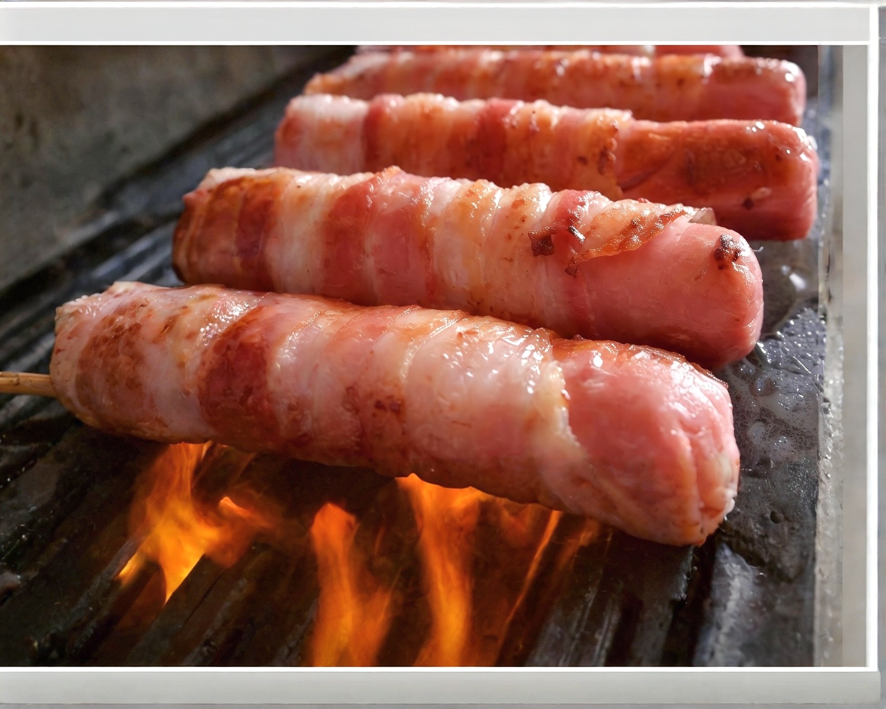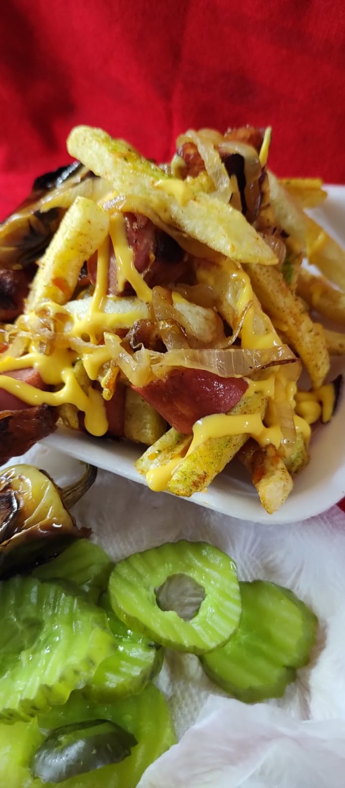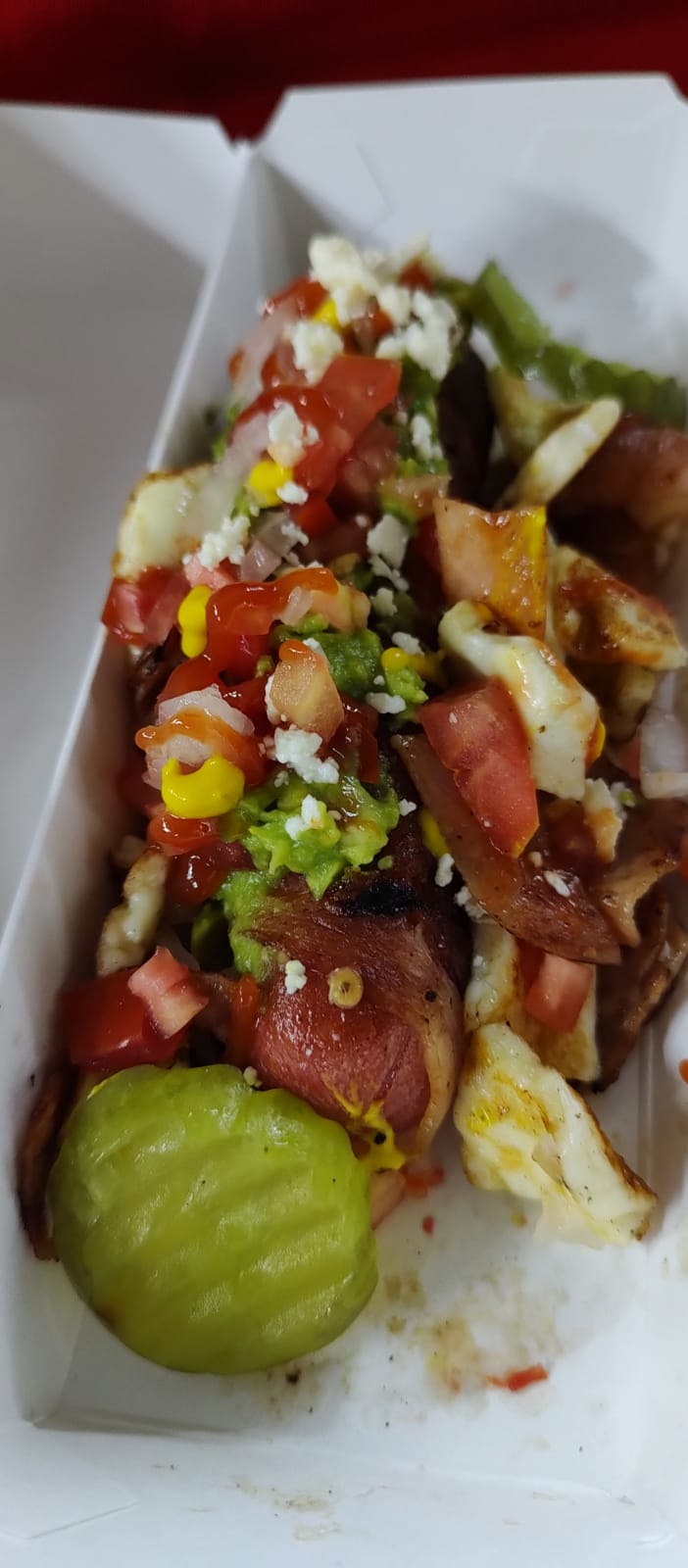 Salchicha de Pavo, Tocino, Crema, Cheese Wiz, Mayonesa, Tomate, Cebolla, Cátsup, Mostaza, Panela, Jamón, Aguacate, Cebolla Asada. El más popular.