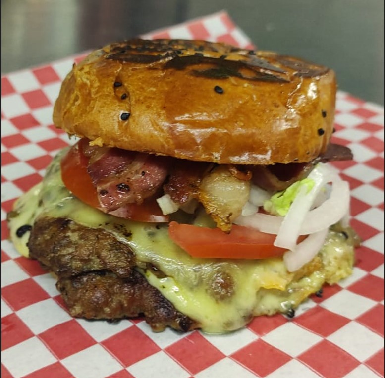 Pan Brioche, Doble Carne, Doble Queso, Jamón, Panela, Chees Whiz, Aguacate, Cebolla Asada, Jitomate, Cebolla, Lechuga y Aderezo de la Casa.