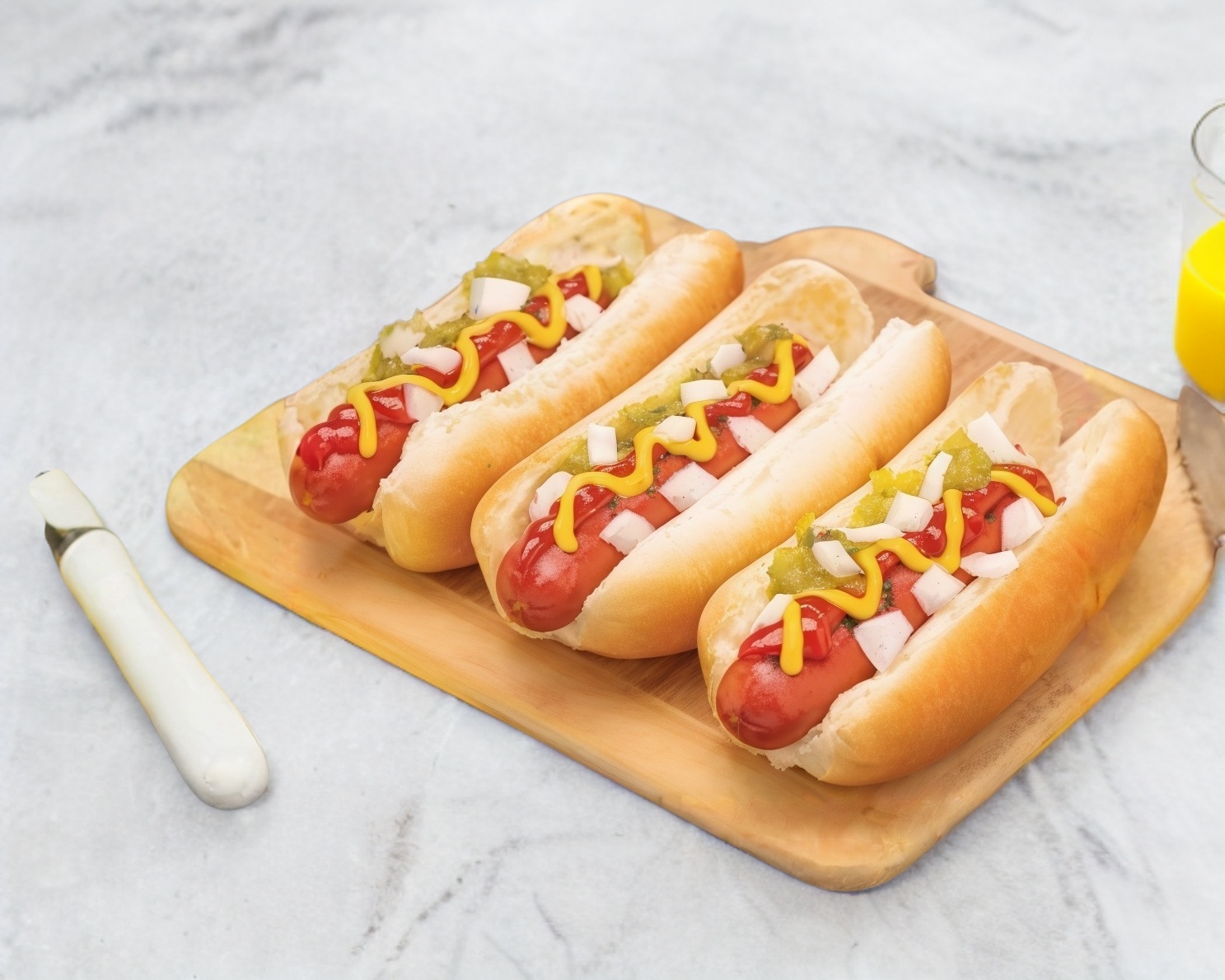 Platillo individual: disfruta de tres deliciosos hot dogs con salchicha tradicional, acompañados de crujiente tocino, crema suave, jitomate fresco, mayonesa, cebolla y un toque de ketchup.