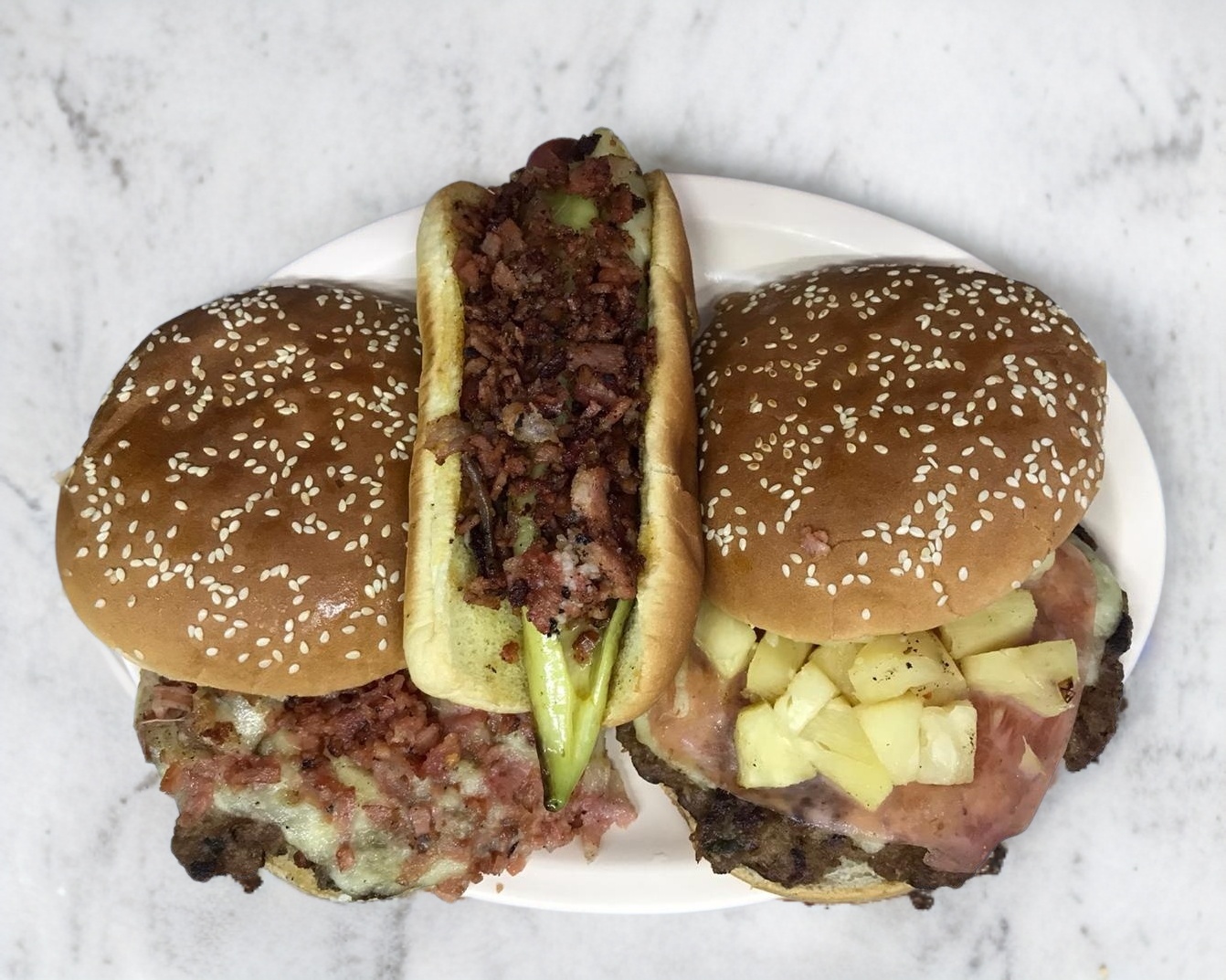 Salchicha, tocino, doble carne, queso blanco y queso amarillo. No lleva papas.