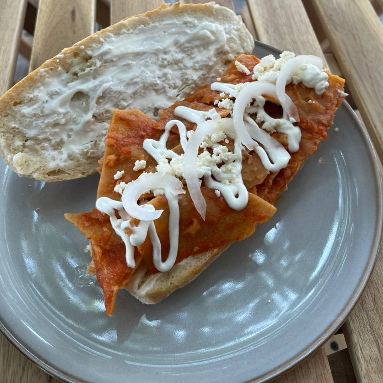 Chilaquiles rojos o verdes, o divorciados, servidos con crema, queso y cebolla, acompañados de frijoles refritos y bolillo.