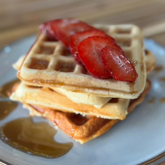 WAFFLES TRADICIONALES DULCES, ACOMPAÑADOS DE FRUTA (FRESA, PLATANO, MANZANA
