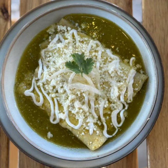 4 pzas De enchiladas de pollo, panela o pierna bañadas en salsa verde con crema, queso y cebolla.