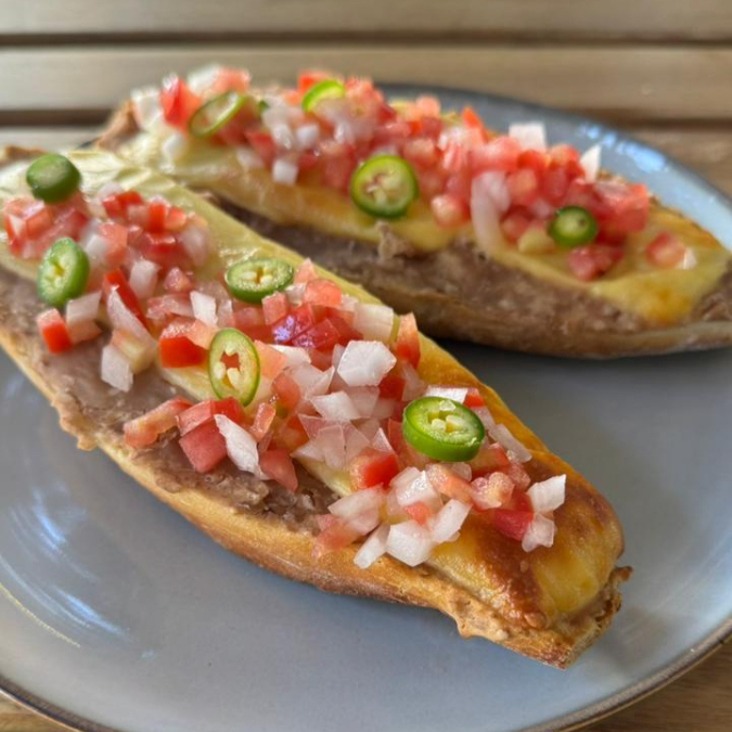 (2 pzas) Pan doradito con frijoles, queso gratinado acompañado de pico de gallo fresco.
