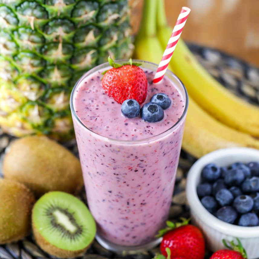 1 Cup de proteína, agua o leche, hielo más fresa.
