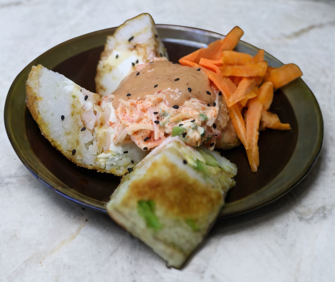 Ricos bocadillos de alga capeada rellenos de ensalada de cangrejo y un marisco a elegir, atún, salmón o camarón con un toque de sriracha.