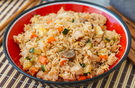 Arroz frito preparado a la plancha con vegetales, a elegir entre pollo, res, camarón o mixto.