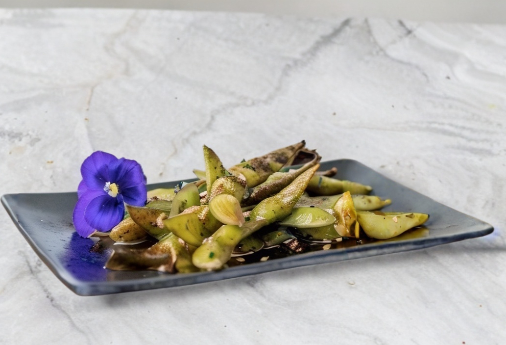 Vainas de soya salteadas en nuestra salsa de la casa oriental o salsa spicy..