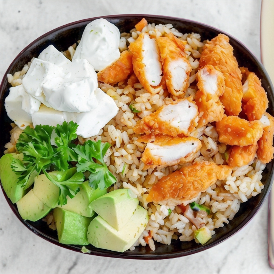 Arroz frito preparado a la plancha con vegetales, aguacate,queso philadelphia y camarón empanizado.