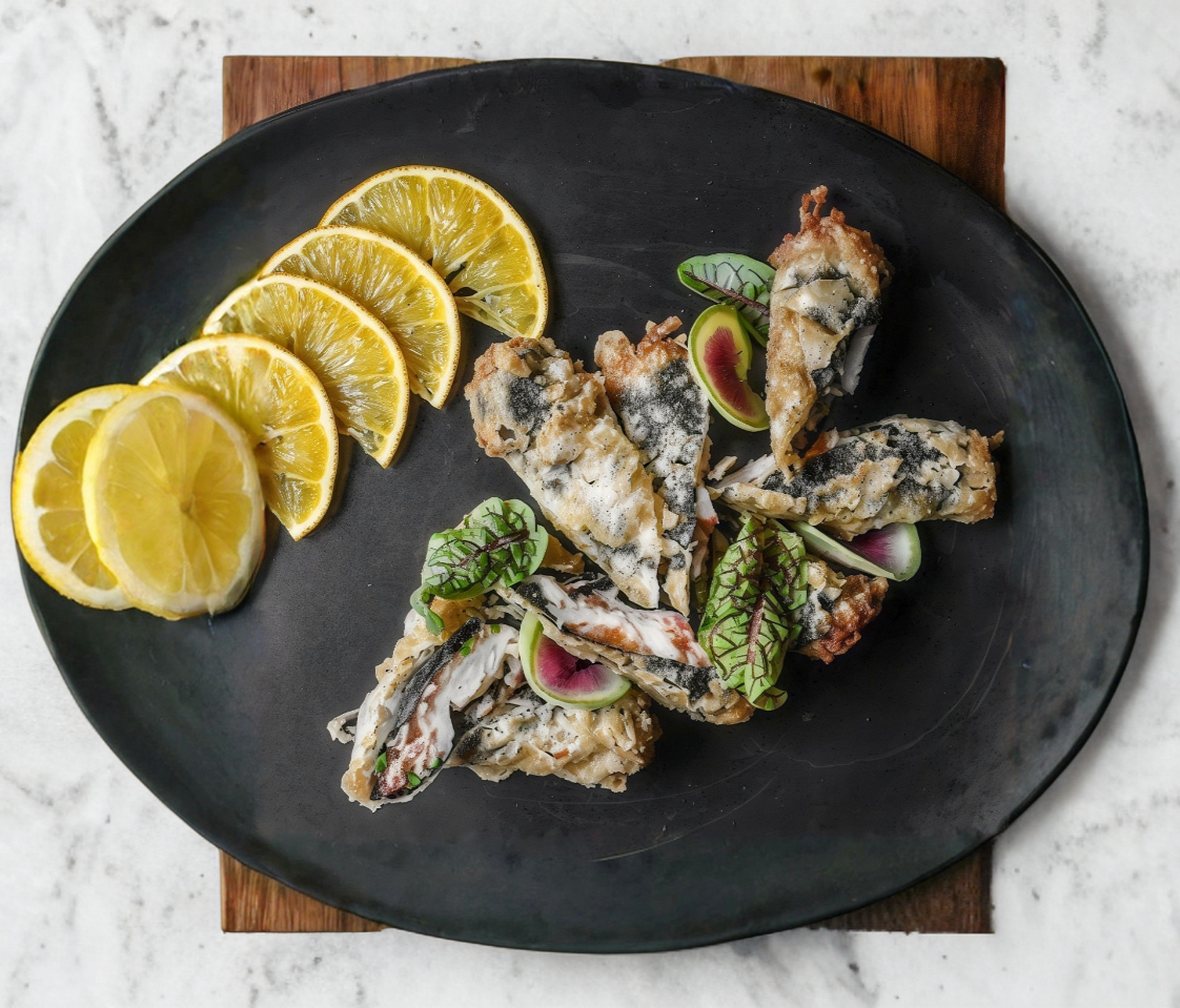 Pan brioche relleno de 170 gr de chashu marinado y flameado, elote amarillo asado, cebollín y ajonjolí. Acompañado de verduras tempura.