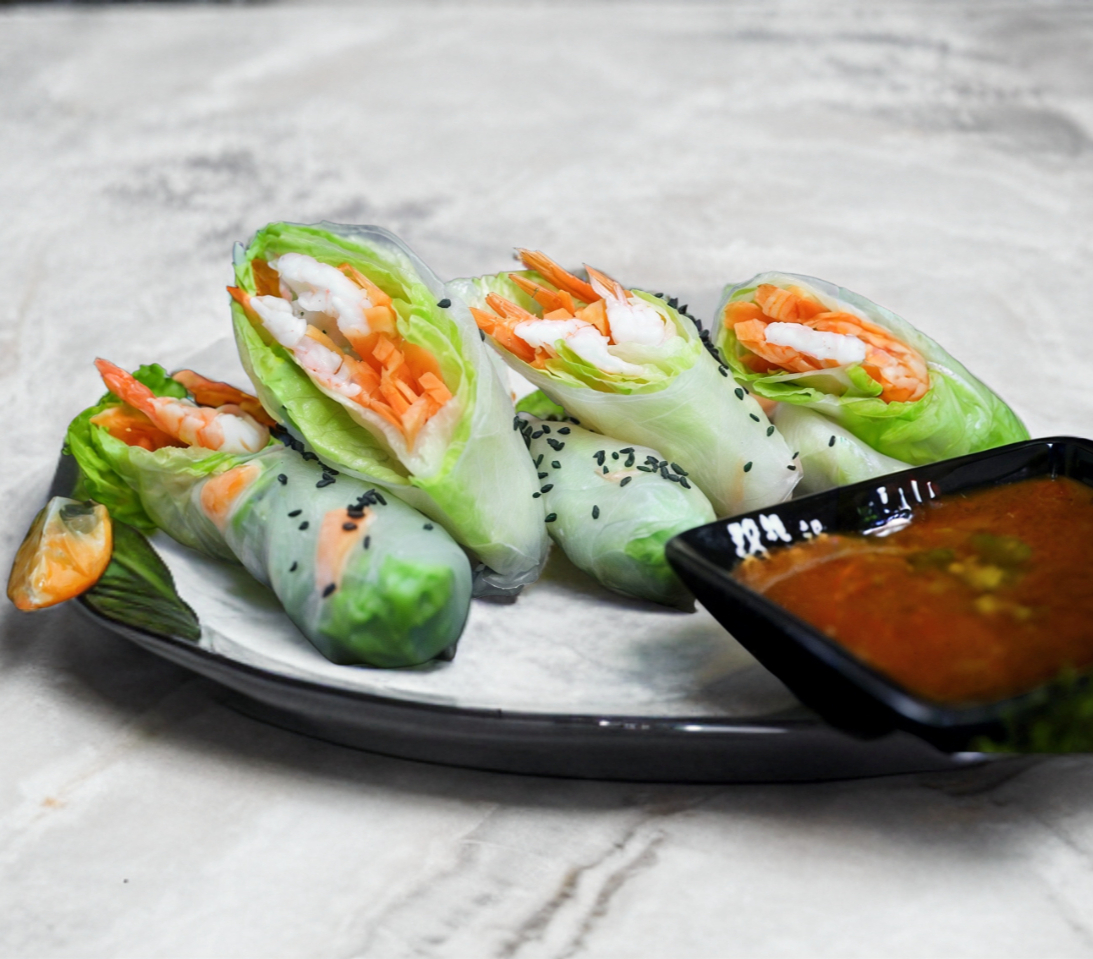 Rollitos envueltos en hoja de arroz y lechuga, rellenos de zanahoria rallada, harusame, crunch de betabel y camarón, acompañados de una salsa dulce especial. (3 pzs)
