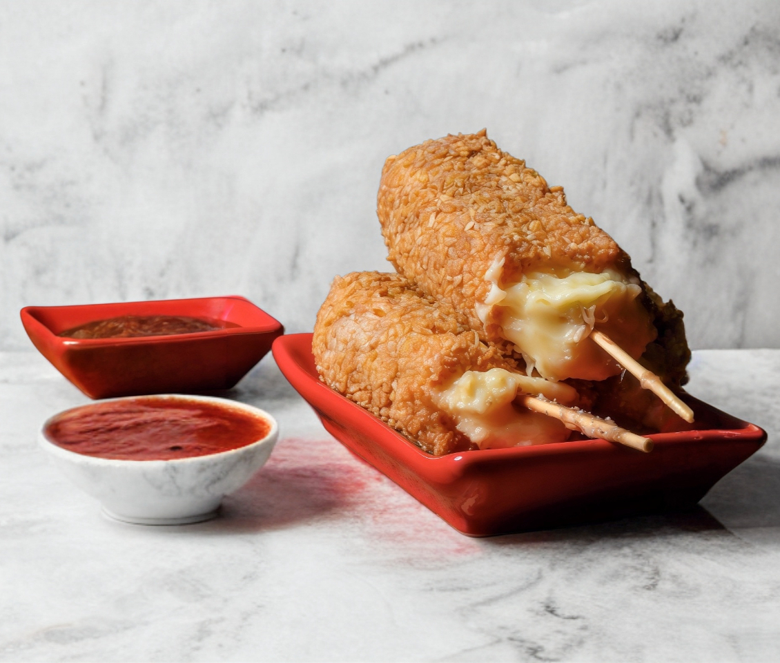 Brochetas JUMBO empanizadas a elegir entre queso gouda, gouda con plátano macho o gouda con pepperoni.