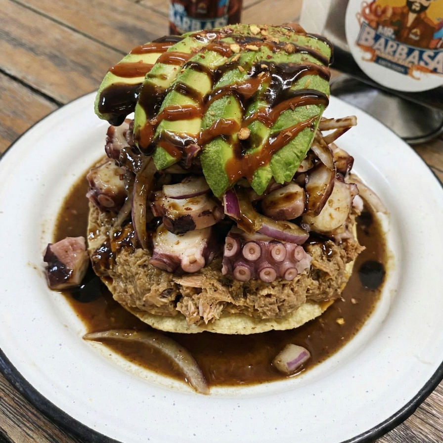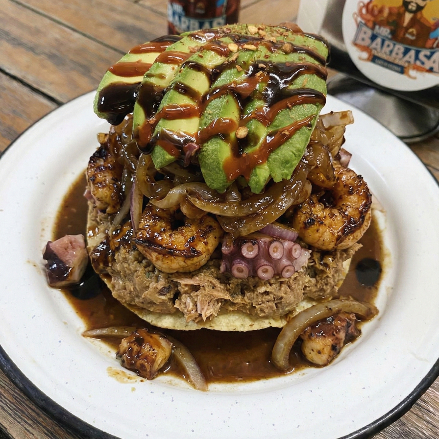 Camarón y pulpo zarandeado con paté y cebolla caramelizada, 150 g.