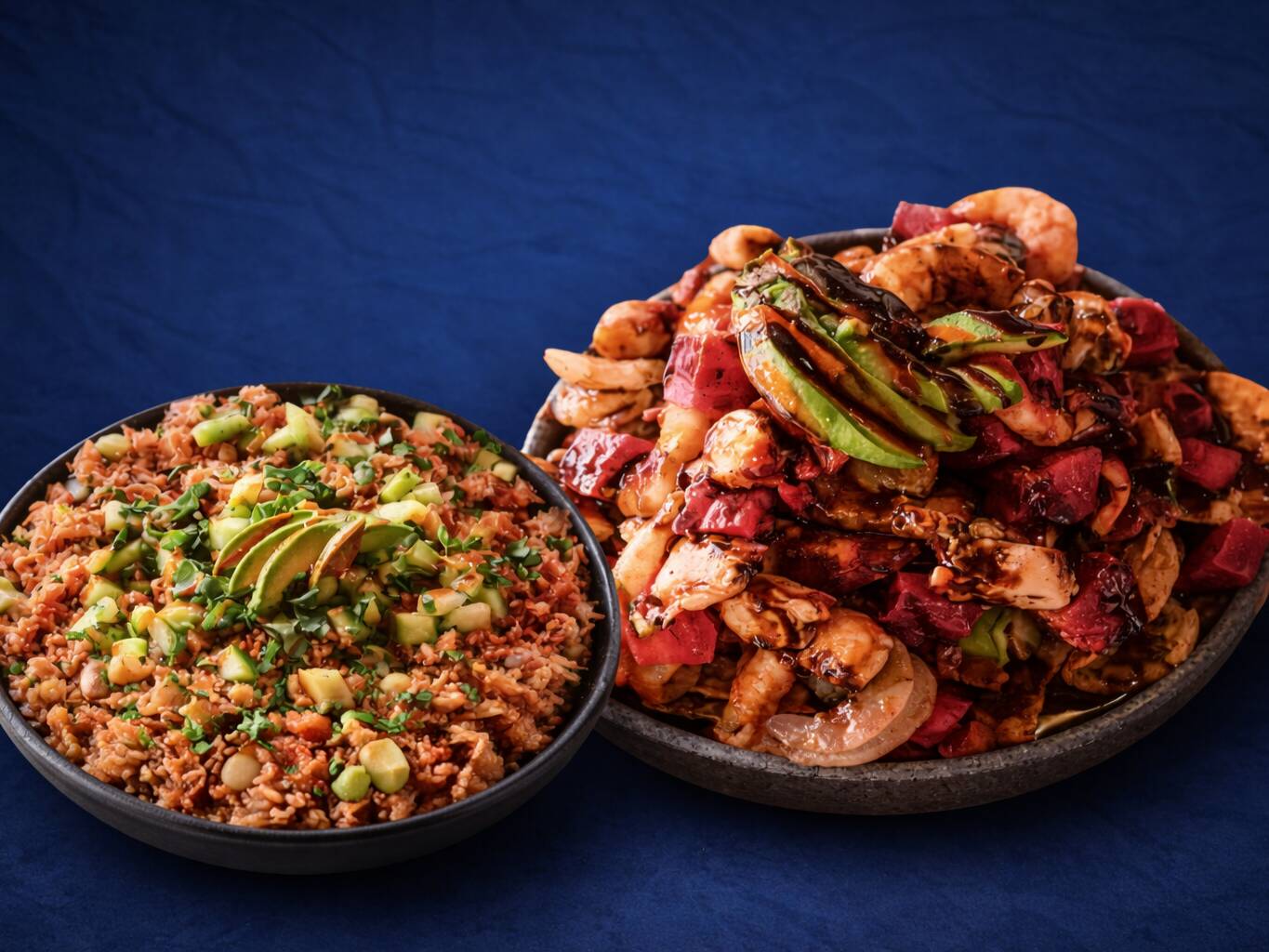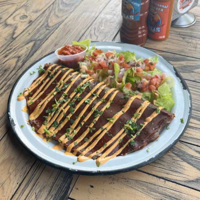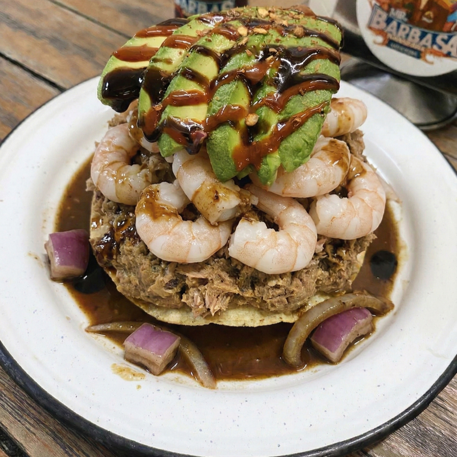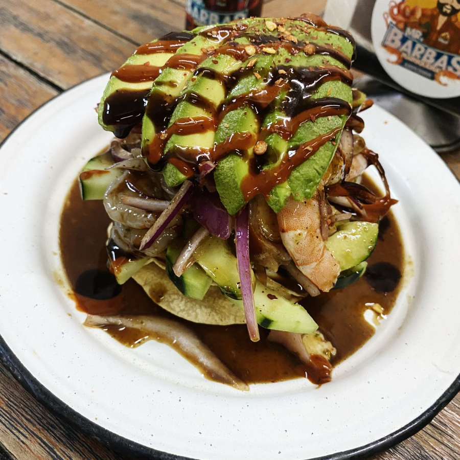 pulpo o camarón zarandeado con guacamole y queso.