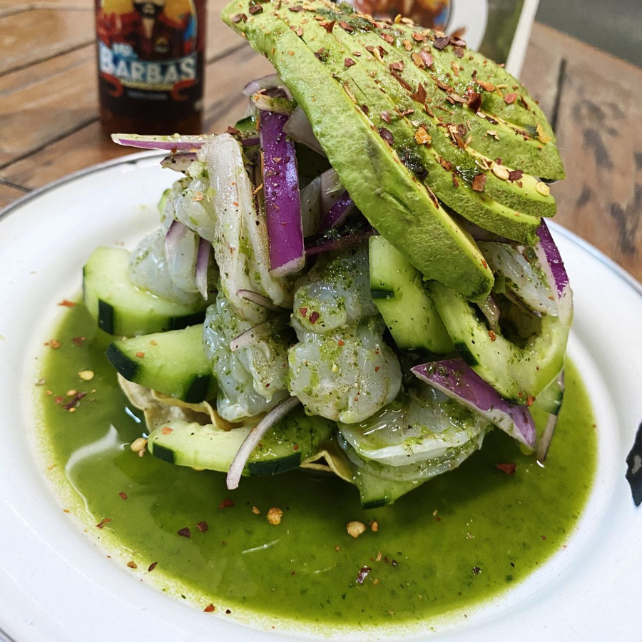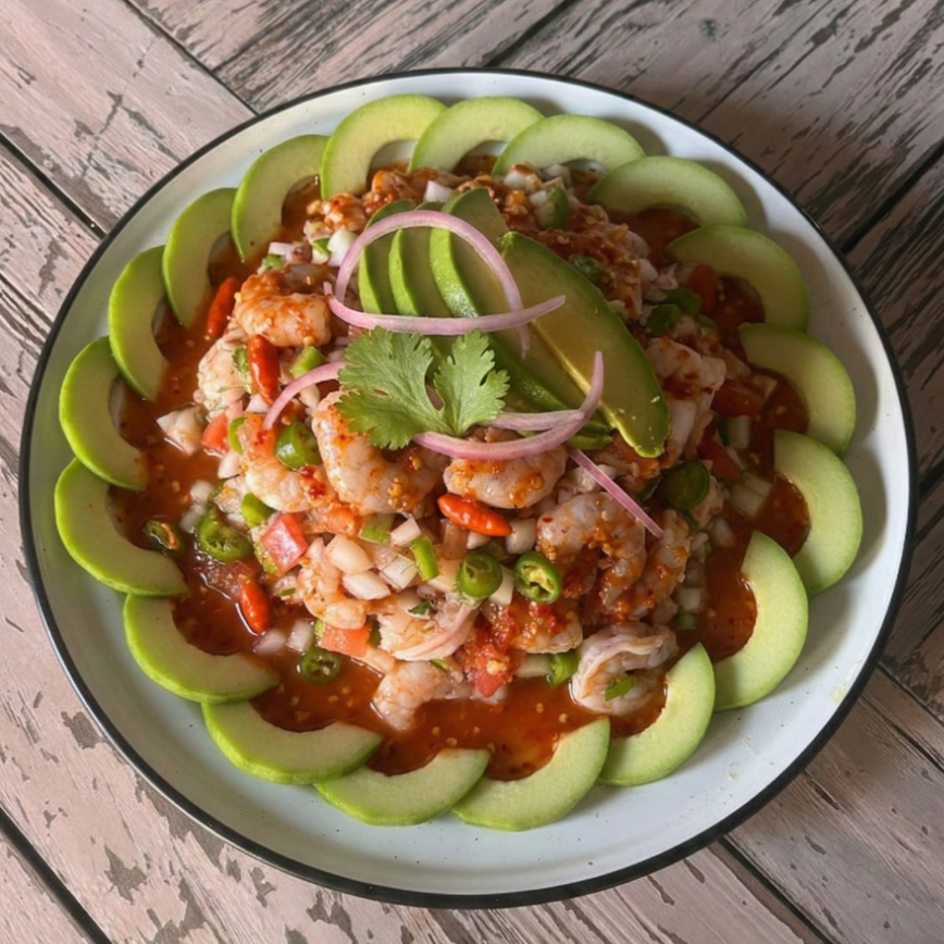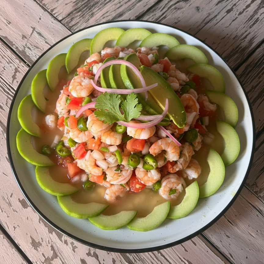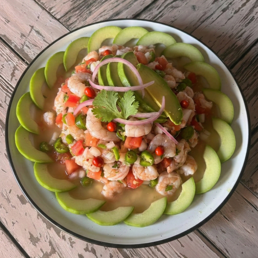 camarón crudo con salsa tradicional d Mazatlán.