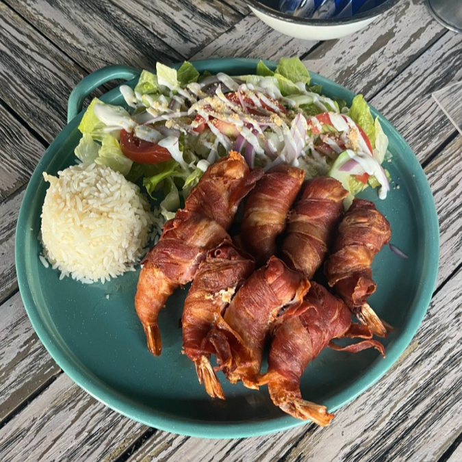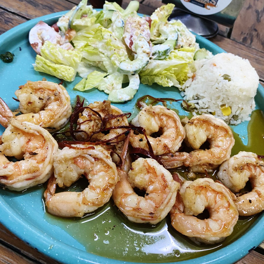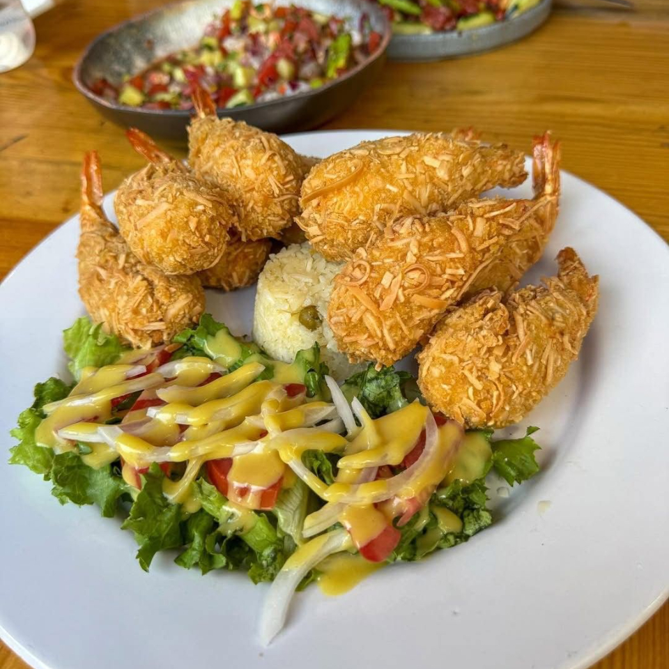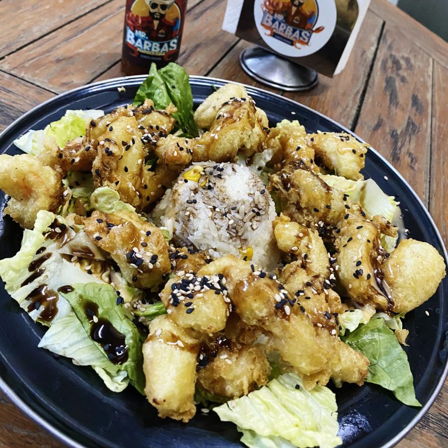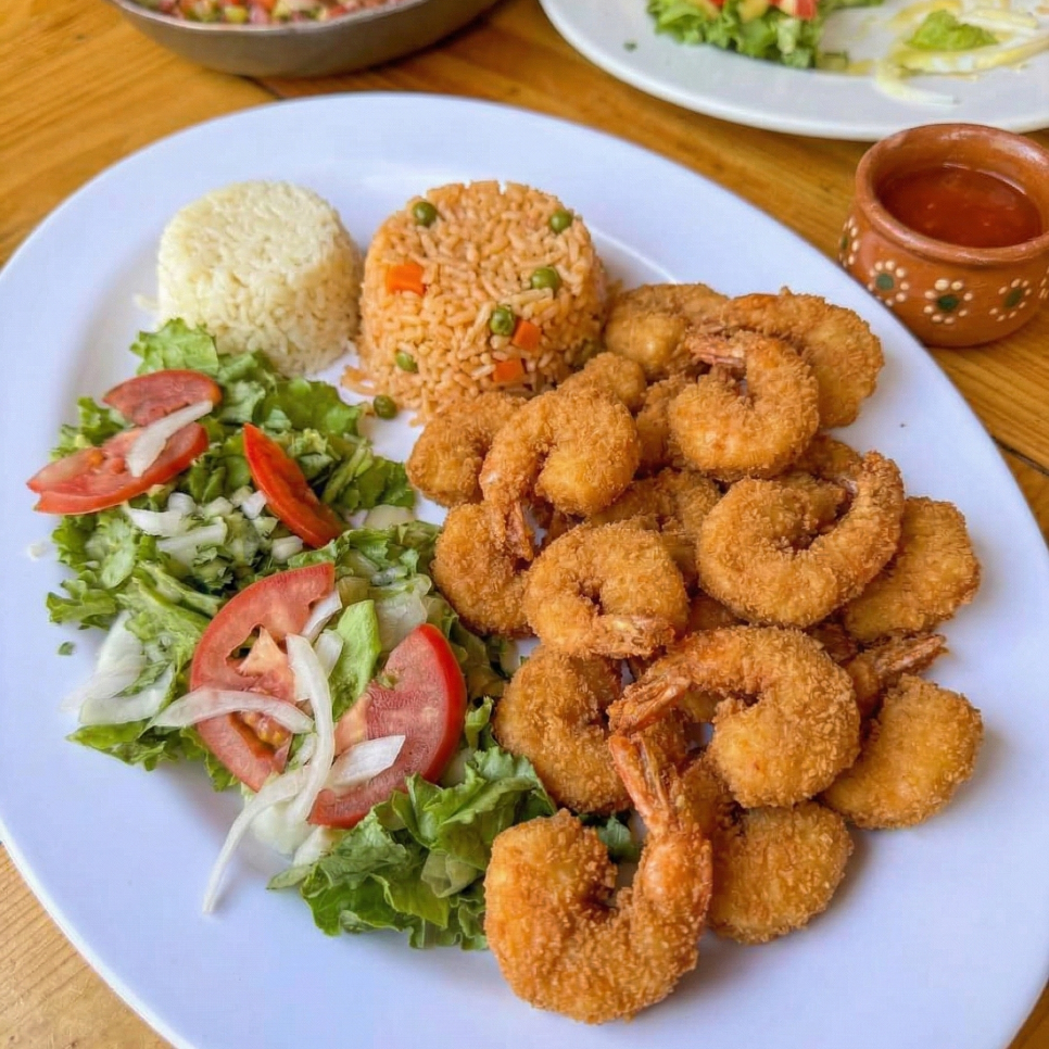 Camarones fritos bañados en salsa roca, 200 g.