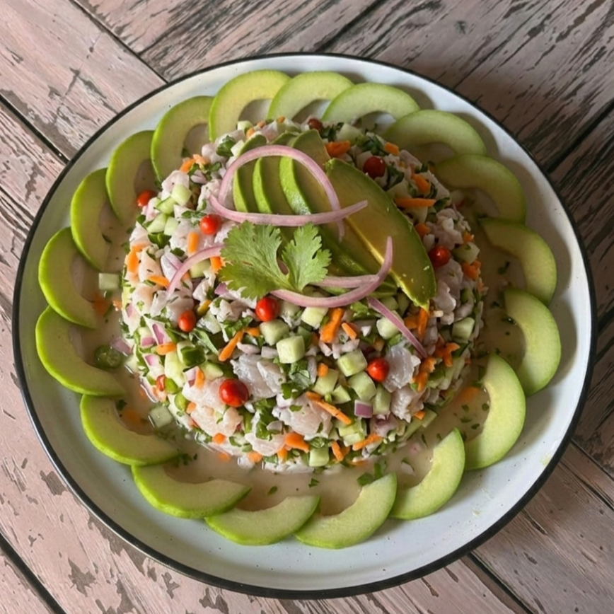 Ceviche de sierra con pepino, cebolla, cilantro y zanahoria, 150 g.