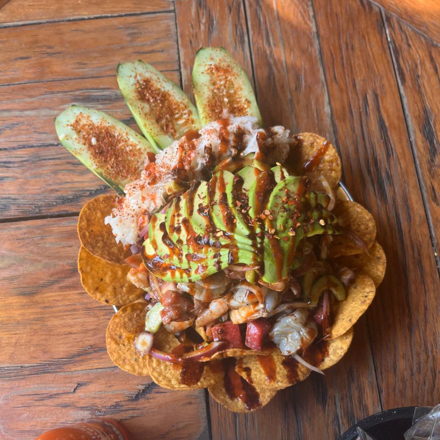 Camarón cocido y de aguachile, atún y pulpo en cama de tostitos, 300 g.