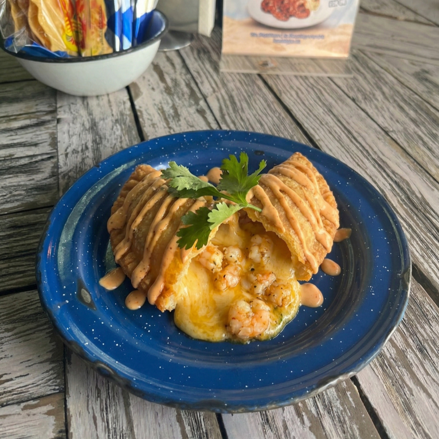 Empanada rellena de camarón con queso y aderezo chipotle.
