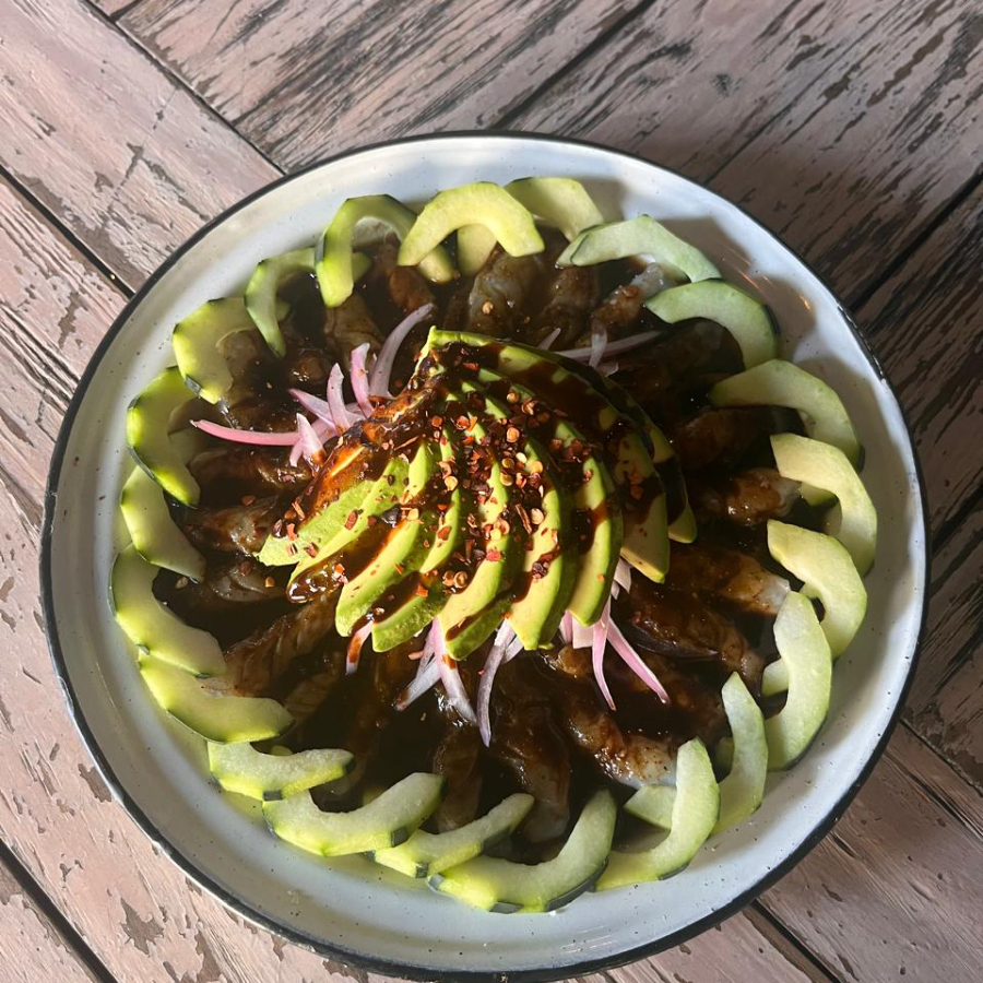 camarón crudo con salsas negras.