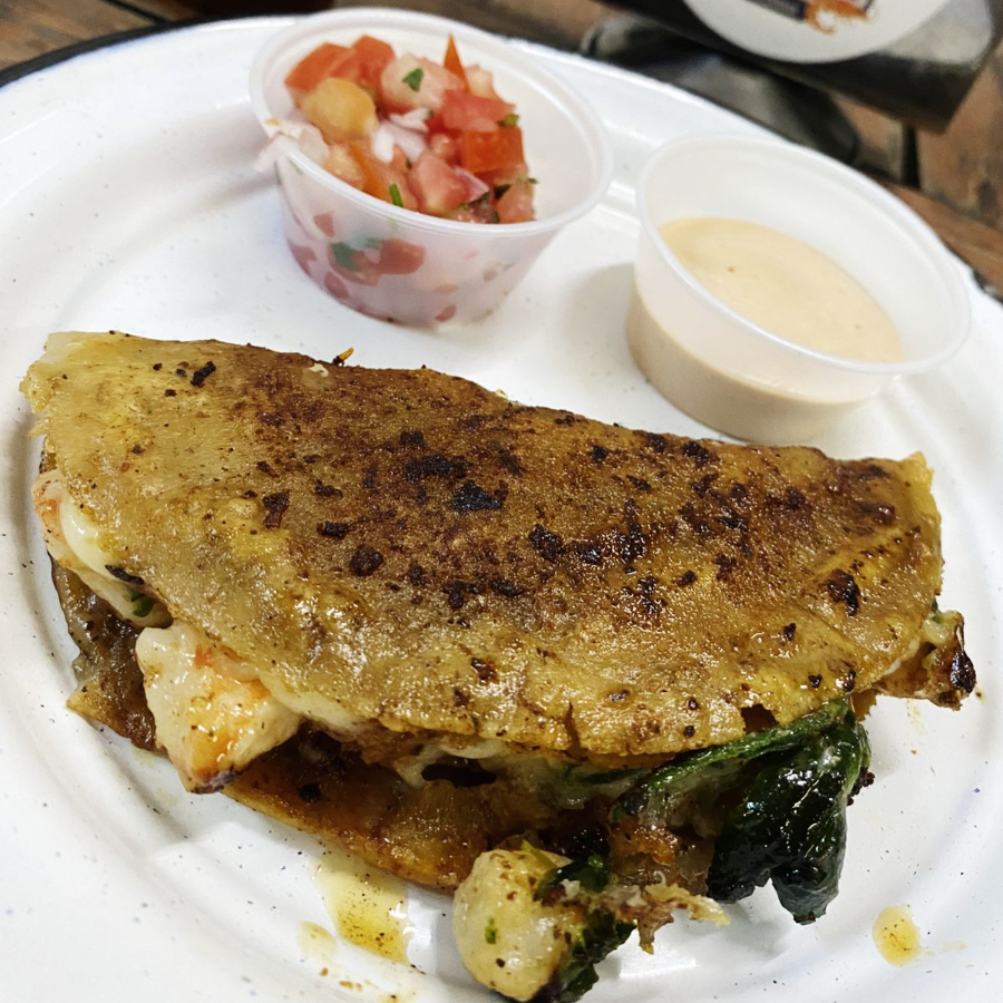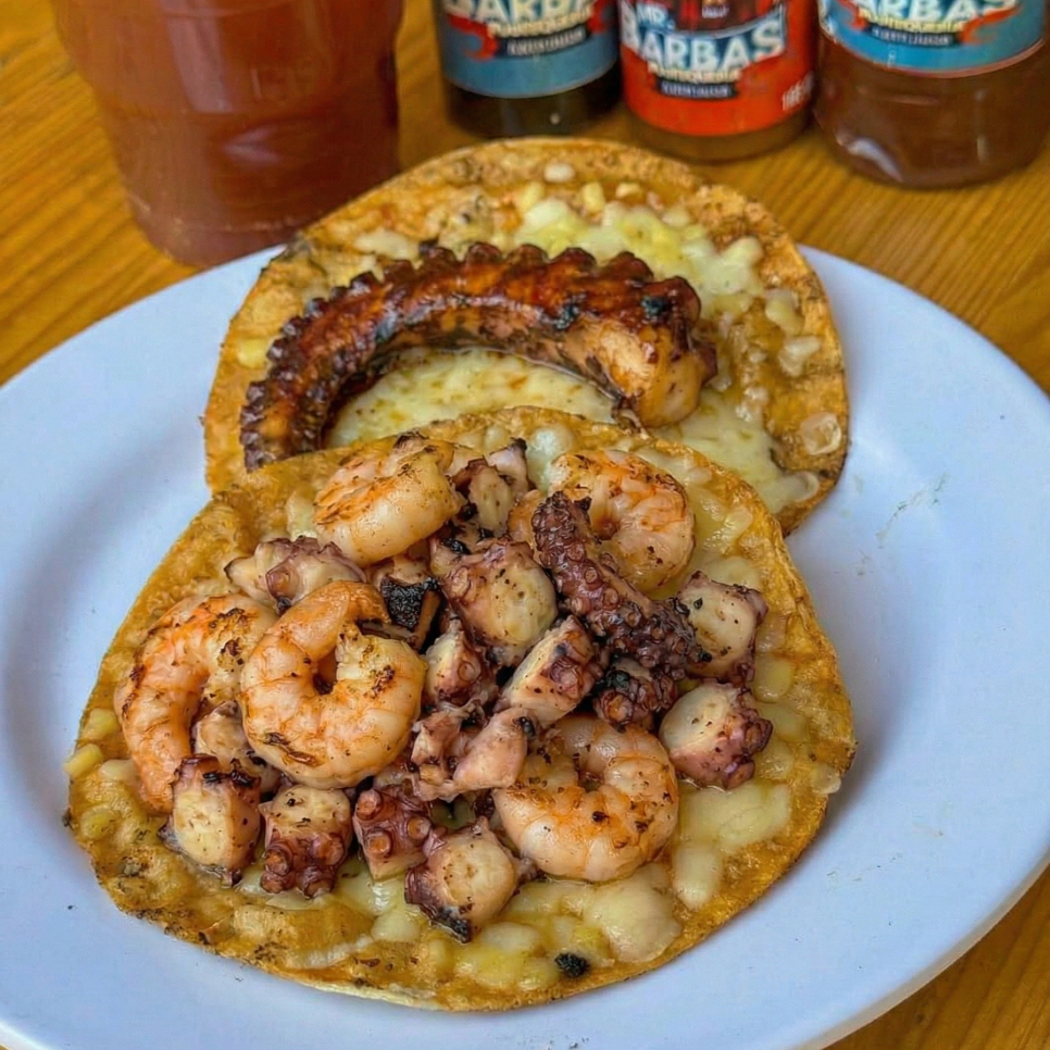 Taco de harina con costra de queso, camarón y pulpo.