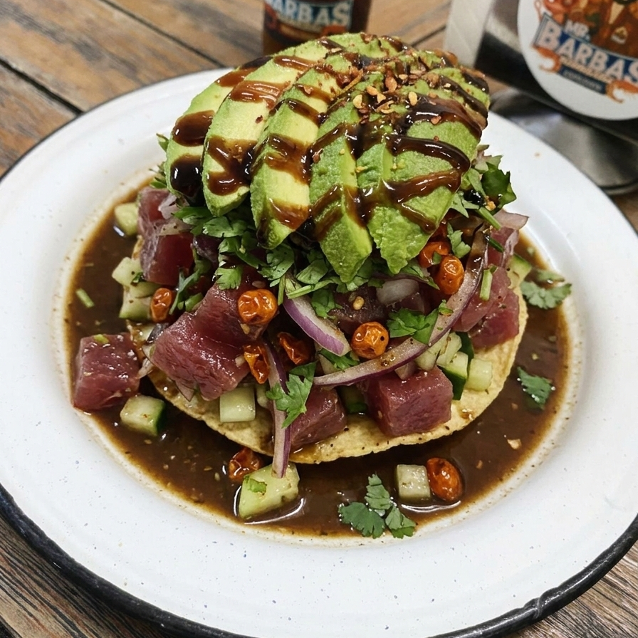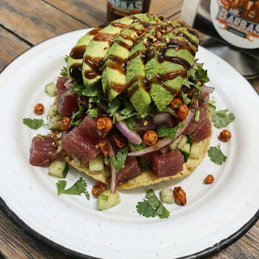 Atún fresco con pepino, cebolla, cilantro y aguacate, 130 g.