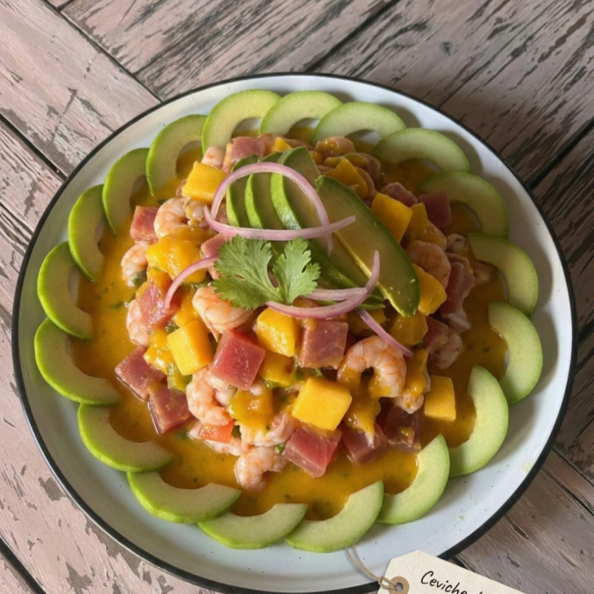 Camarón cocido y atún bañado en salsa de mango con trozos de mango, 200 g.