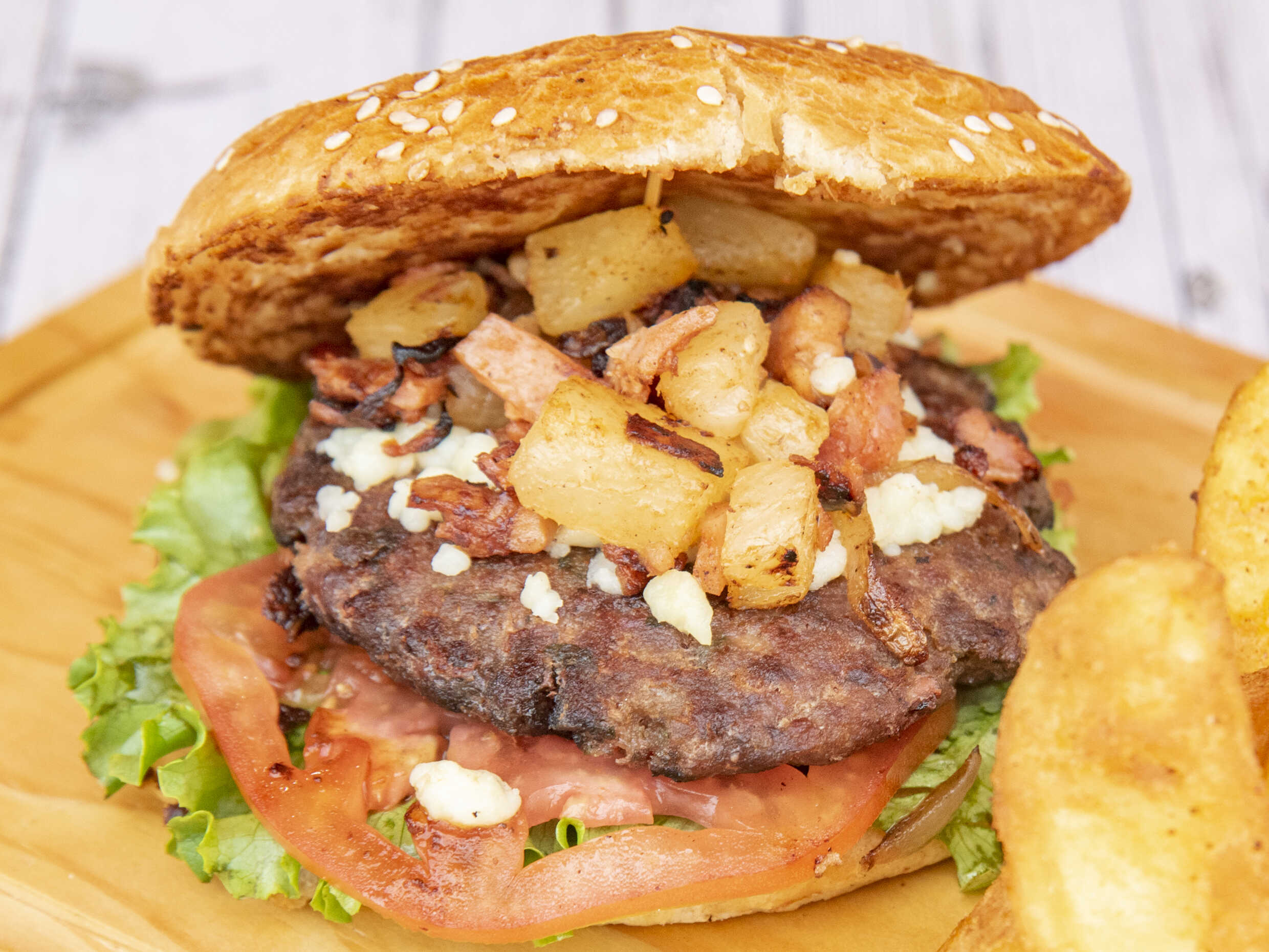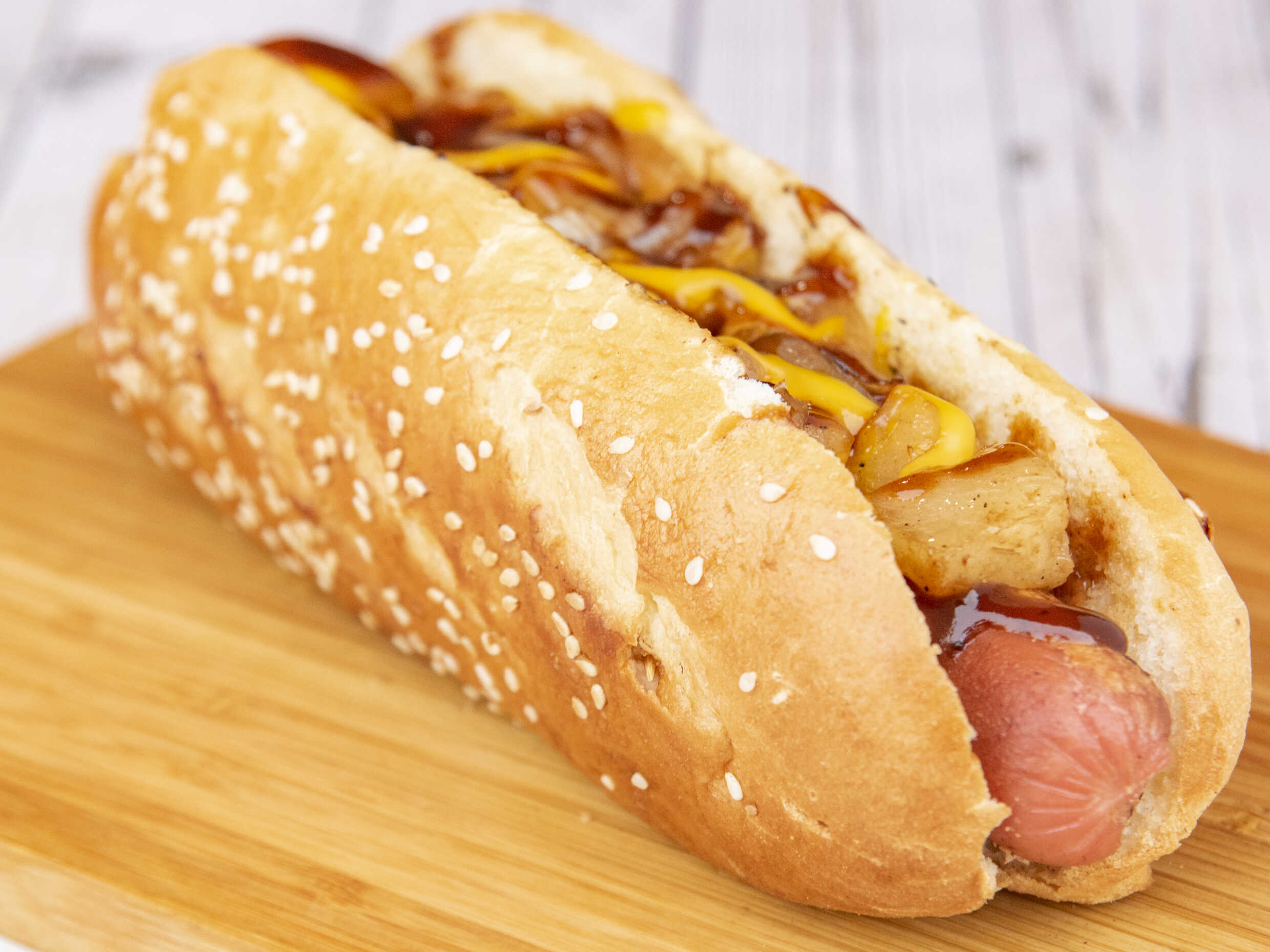 Con salchicha de pavo envuelta en tocino, cebolla guisada, piña, salsa BBQ y queso amarillo.